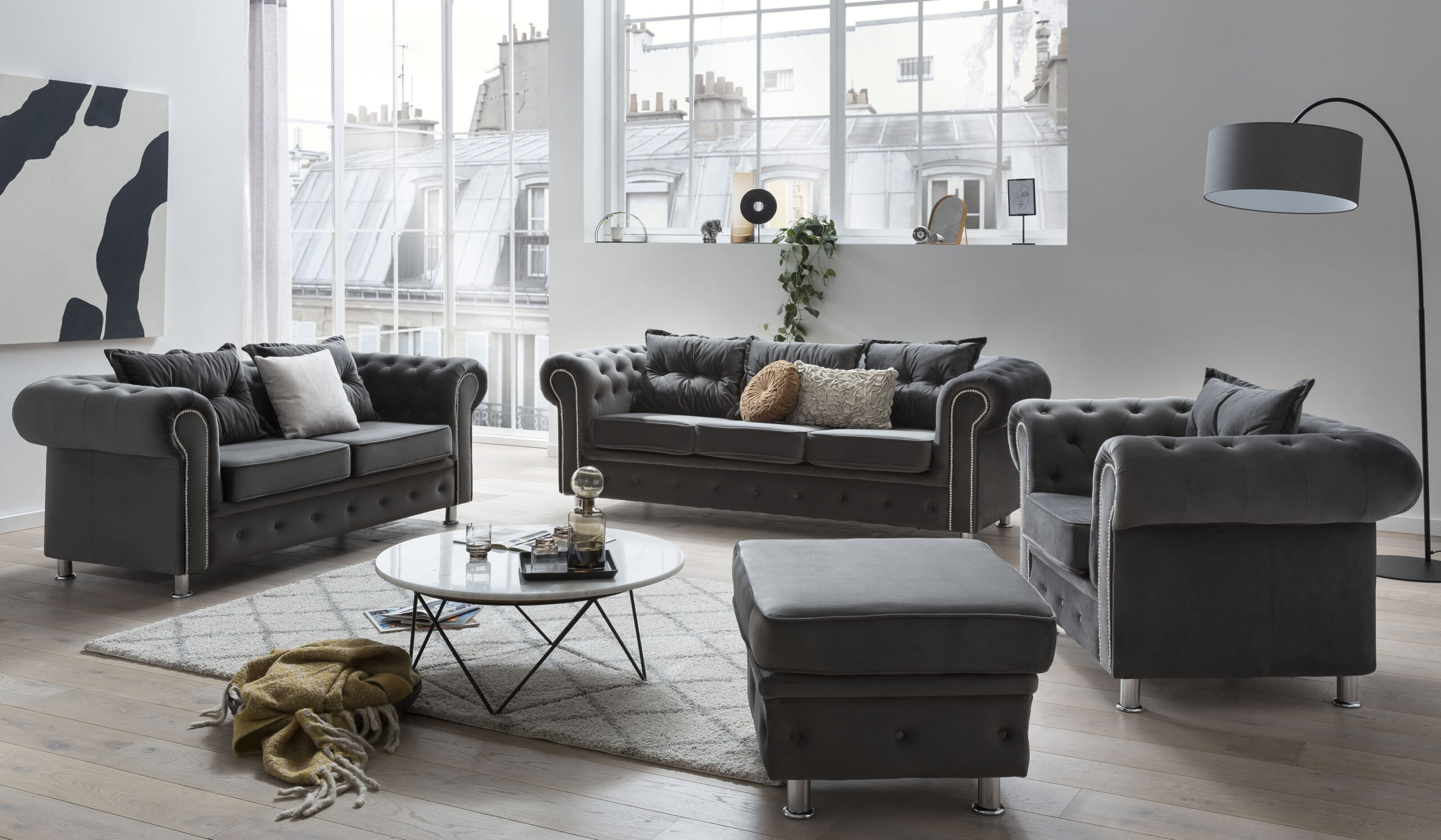 Trivietė ir dvivietė sofos taip pat gali būti komplektuojamos su miego funkcija, todėl šis rinkinys derina stilių su praktiškumu. Modernus dizainas, subtiliai suapvalintos formos ir komfortiškos sėdimosios pagalvės suteikia baldui išskirtinį jaukumo ir elegancijos pojūtį.