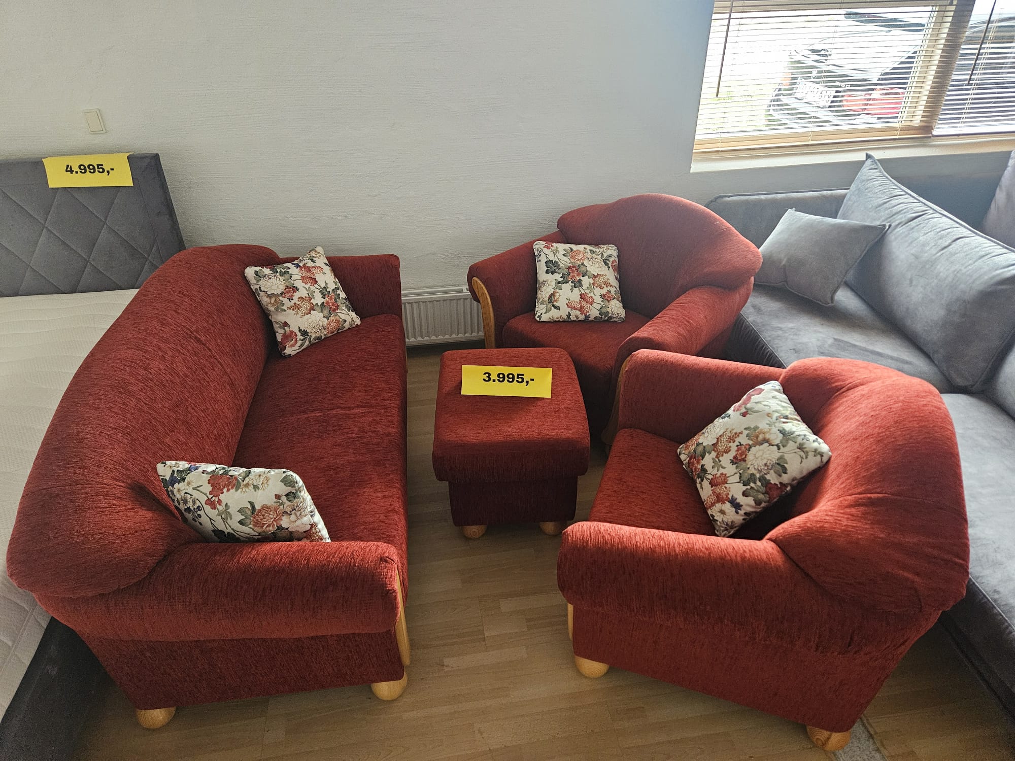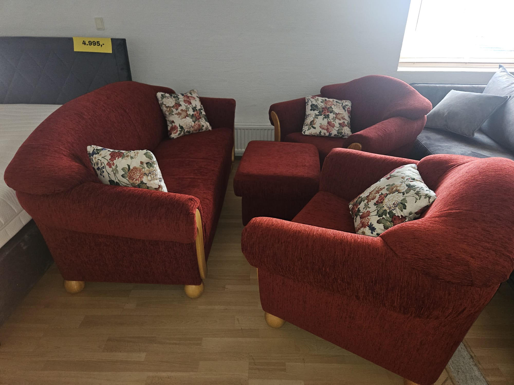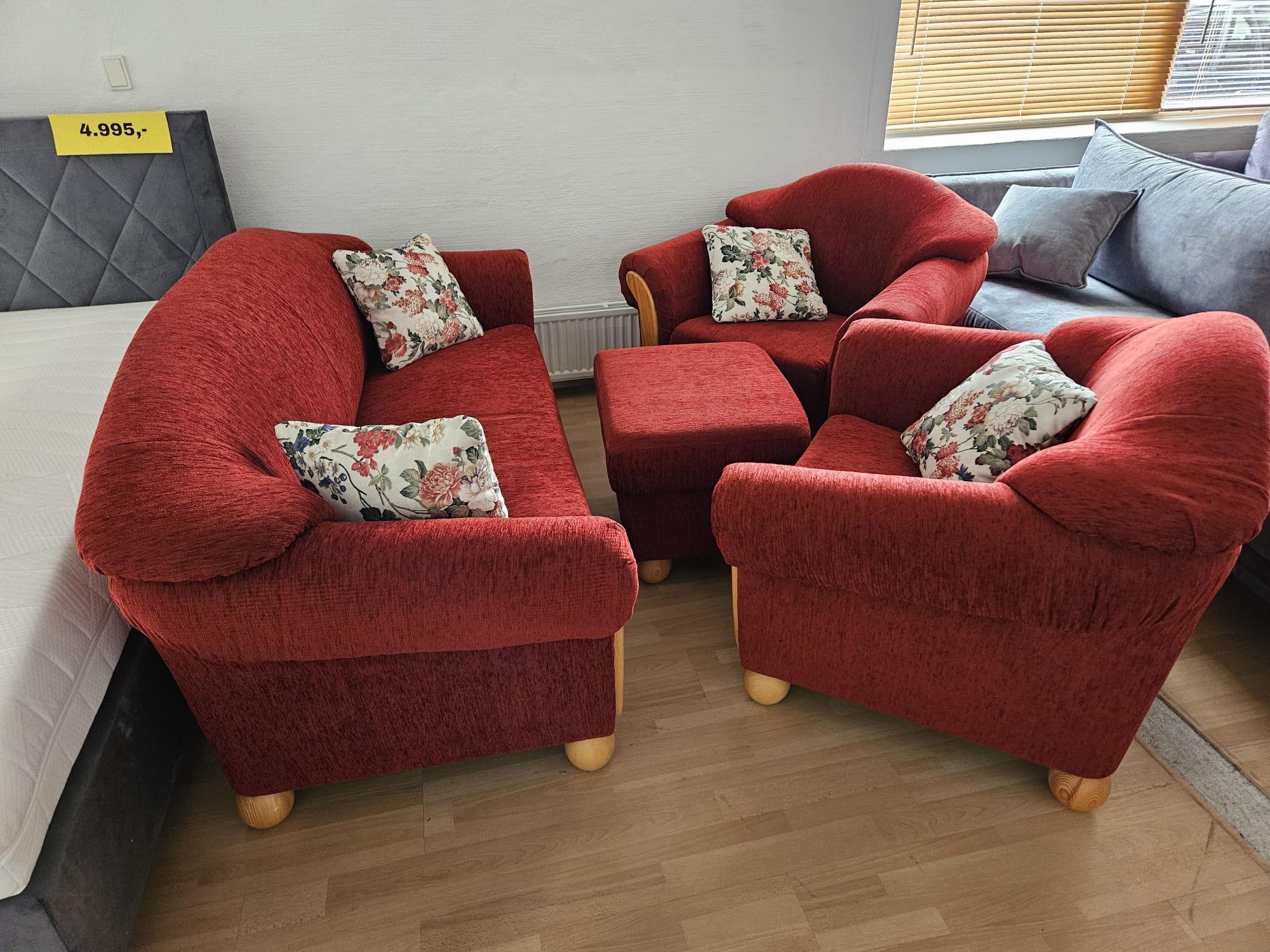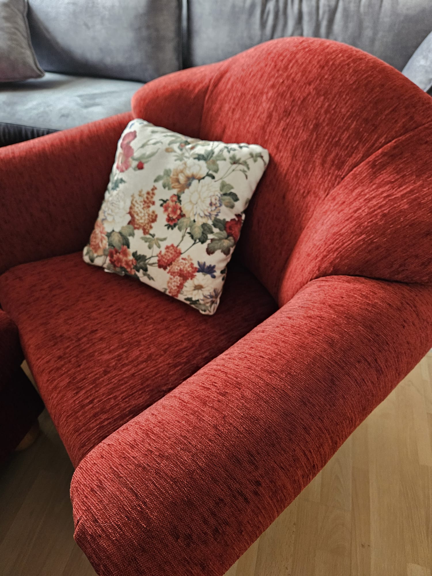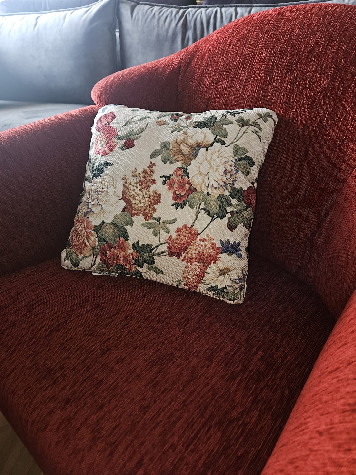 Klasikinio stiliaus baldų komplektas „MATILDA“ – tai elegantiškas pasirinkimas jaukiai svetainei. Komplektą sudaro dvivietė sofa, du foteliai ir pufas. Ryškiai raudonos spalvos gobelenas suteikia interjerui charakterio ir šilumos, o medinės kojelės išryškina klasikinį dizainą. Komplektas papildytas dekoratyvinėmis pagalvėlėmis su gėlių raštais, kurios suteikia išskirtinio žavesio.