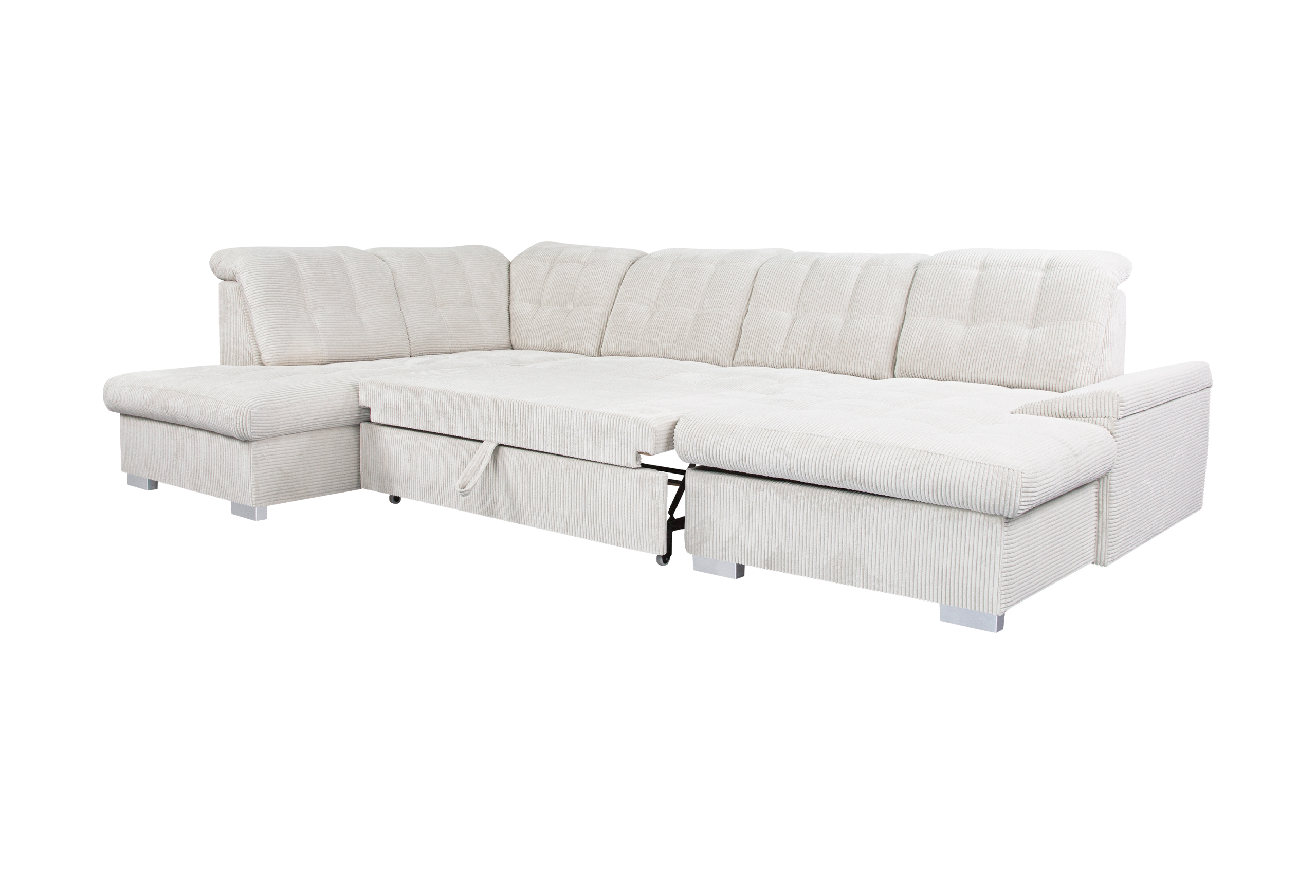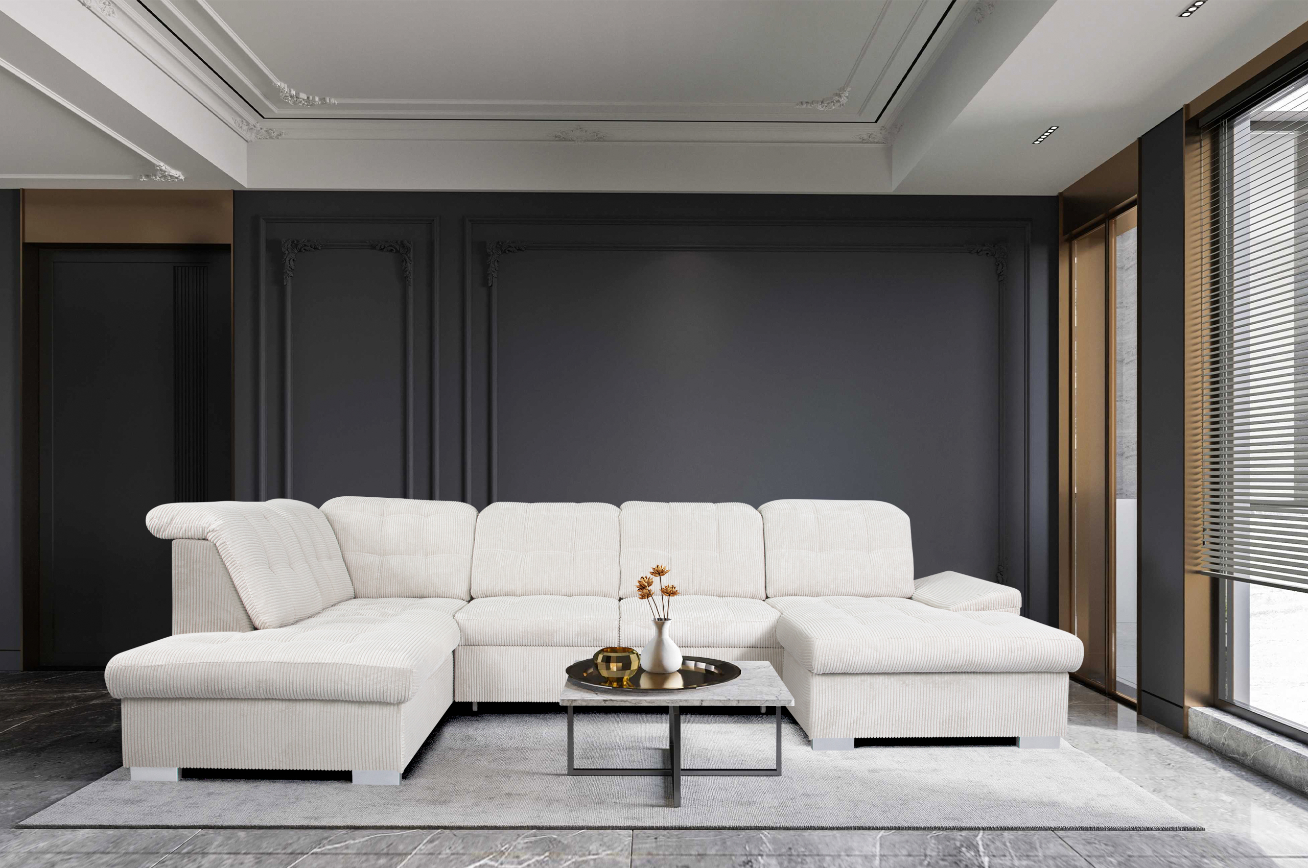 Prabangi ir funkcionali U formos miegamoji sofa „NEBRASKA“ – tai puikus pasirinkimas tiems, kurie vertina komfortą, estetiką ir praktiškumą. Sofa aptraukta plačiu veliūru „Posso 100“, kuris yra švelnus, malonus liesti ir kartu itin atsparus dėvėjimuisi. Šviesi smėlio spalva suteikia interjerui lengvumo ir elegancijos pojūtį.