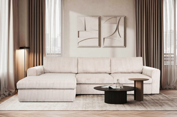 „PIER“ kampinė sofa sujungia elegantišką dizainą ir komfortą. L formos konstrukcija su šezlongu suteikia daugiau vietos patogiam poilsiui ir leidžia mėgautis kasdienėmis atsipalaidavimo akimirkomis.