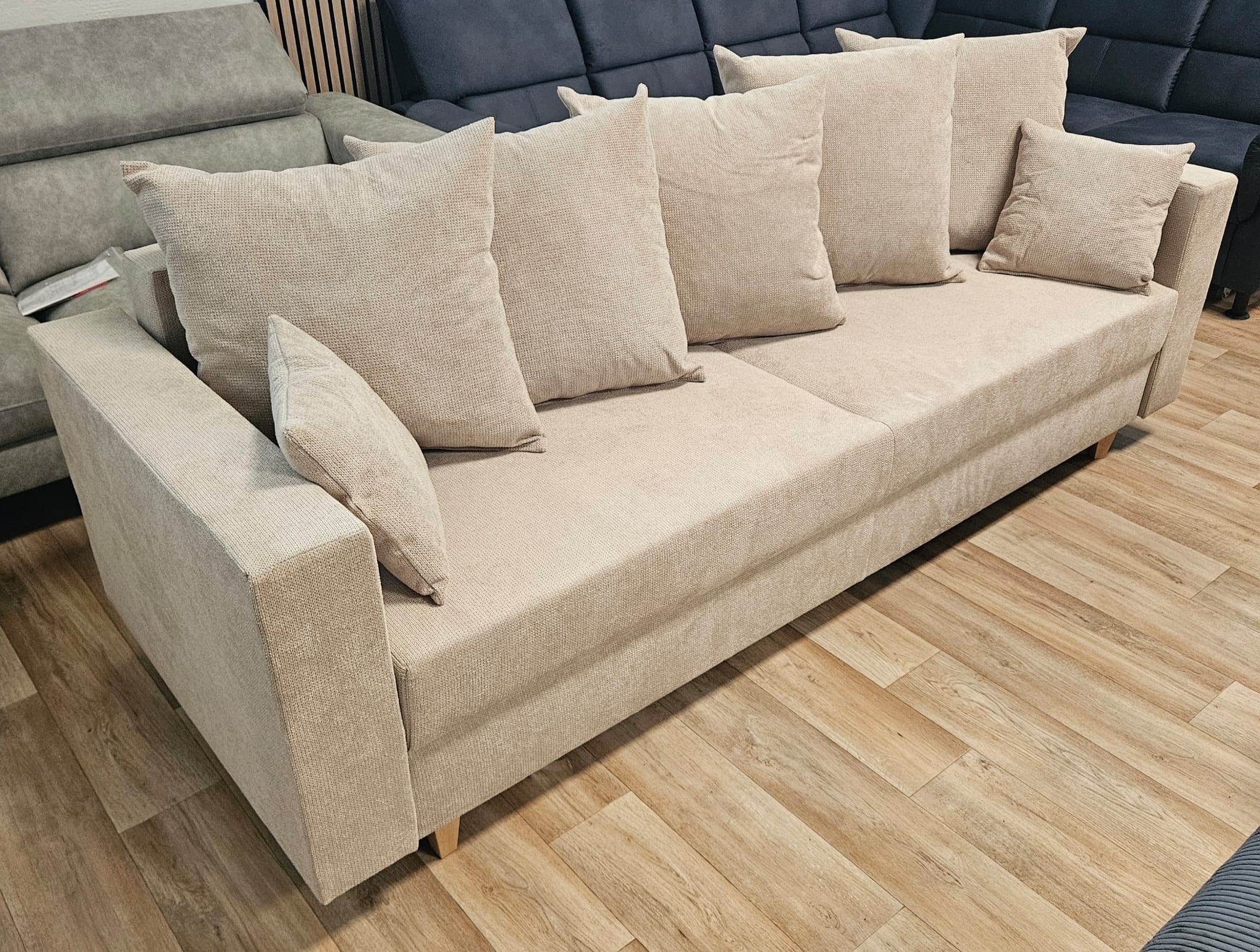 Šiuolaikiško dizaino sofa–lova „KRIS“ – tai funkcionalus ir elegantiškas baldas, puikiai tinkantis tiek svetainėje, tiek svečių kambaryje. Smėlio spalvos audinys ir medinės kojelės suteikia jaukumo bei lengvumo pojūtį. Sofa turi miegamąją funkciją ir erdvią patalynės dėžę, o komplekte esančios didelės ir mažos pagalvėlės užtikrina papildomą komfortą.