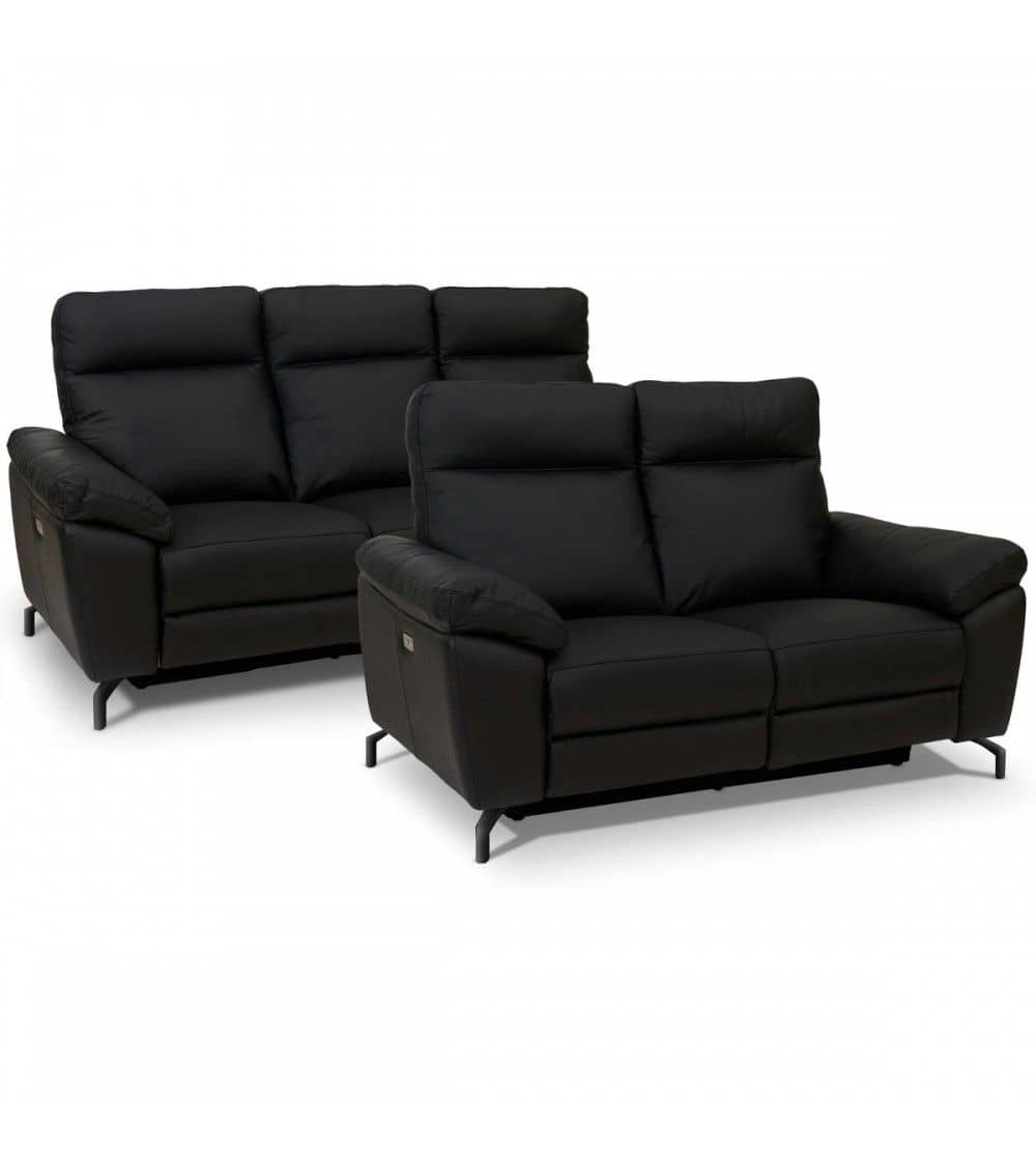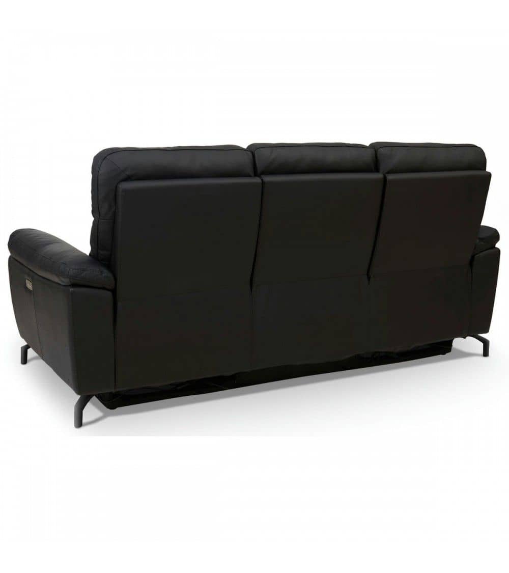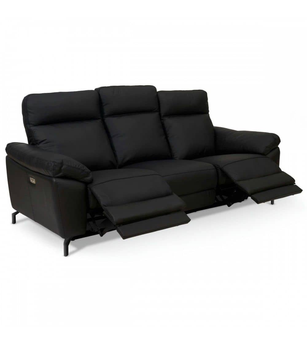 Sort 3-personers elektrisk lænestol i læderlook med polstring af ægte læder og PVC. Elektrisk justerbare ryglæn og fodstøtter på gavlesæderne med USB-porte i armlænene. Sædehynderne er lavet af skum og pocketfjedre; ryglænet er fyldt med 33 kg/m³ skum. Støttet af sorte metalben og en træ-metalramme. Designet til indendørs brug. Sædebredde: 162 cm. Sædehøjde: 46 cm. Montering af ryglæn påkrævet. Rengøres med en fugtig klud eller et læderplejeprodukt.