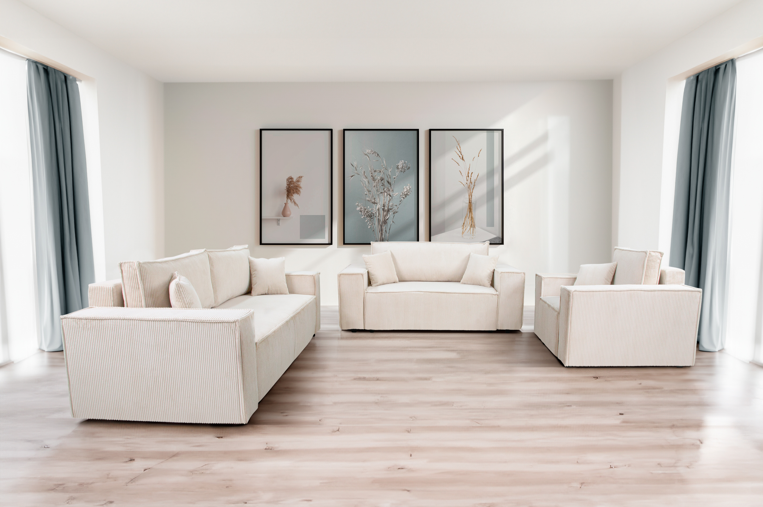 Stilingas ir praktiškas „Nizza“ svetainės komplektas, sudarytas iš trivietės sofos su miegama funkcija, dvivietės sofos ir fotelio. Tai idealus pasirinkimas norintiems suderinti komfortą, funkcionalumą ir elegantišką dizainą.