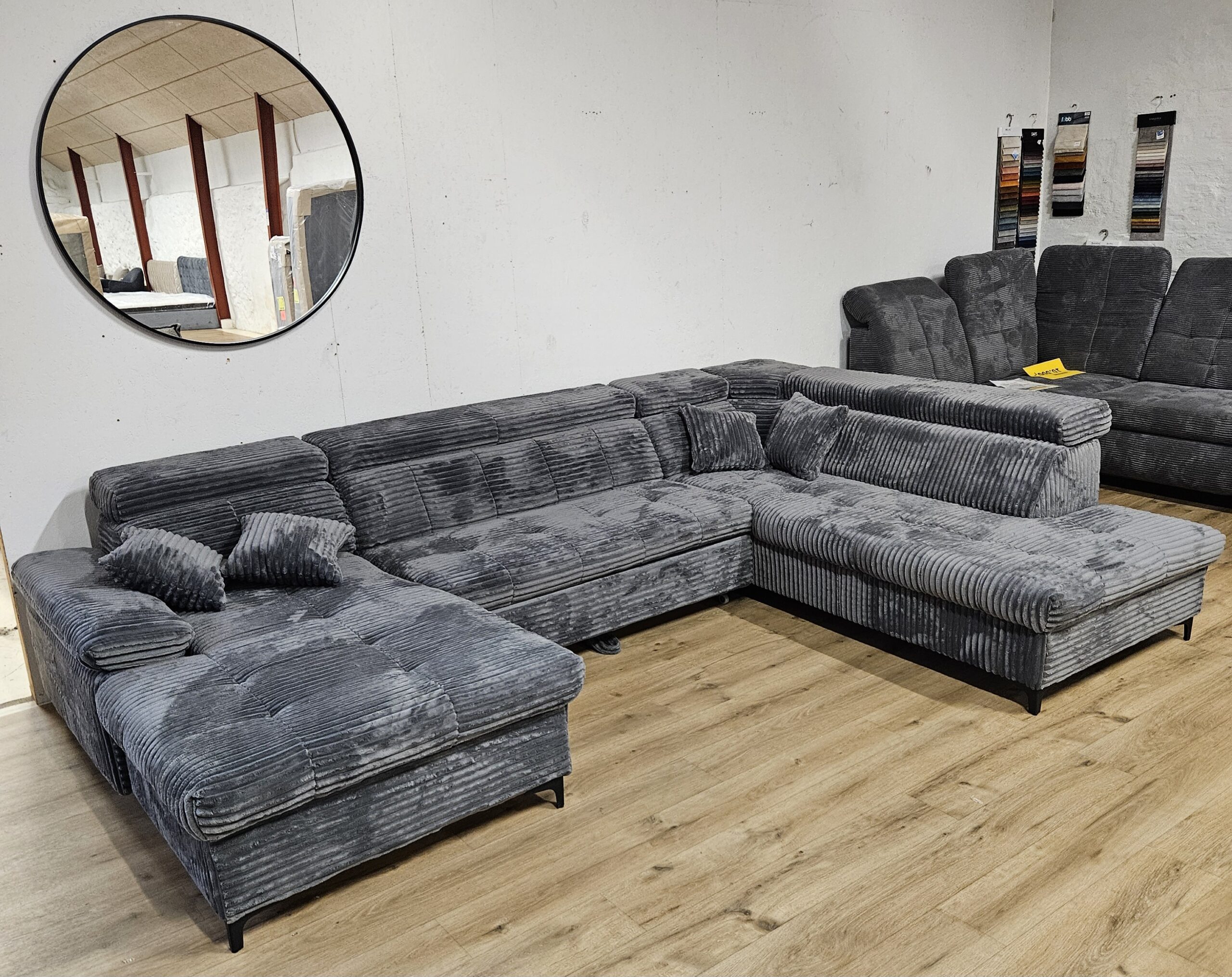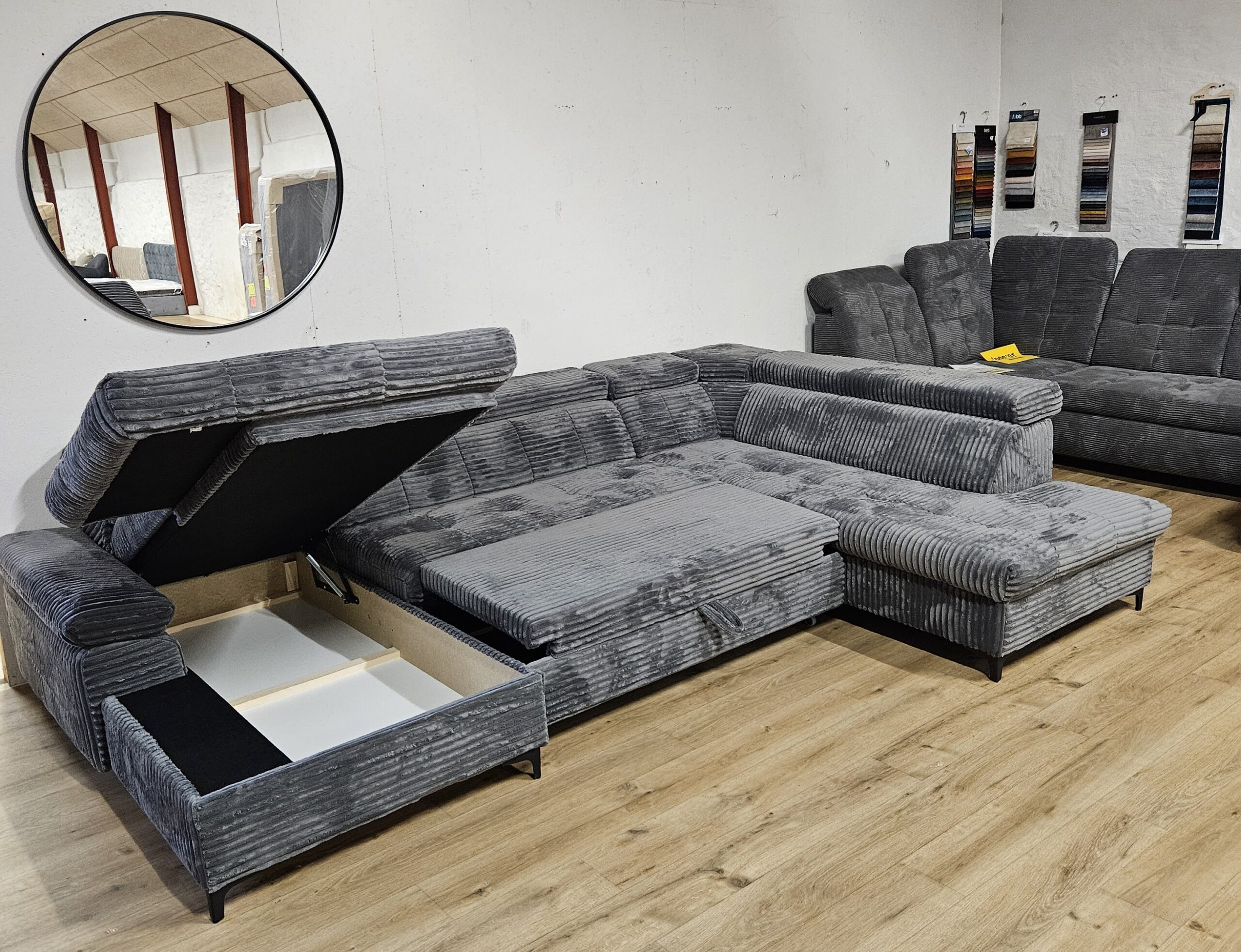 Moderni ir prabangi U formos sofa su miegama funkcija „SATURN“ – tai stilingas pasirinkimas tiems, kurie vertina komfortą ir šiuolaikinį dizainą. Sofa aptraukta minkštu, švelniu pilkos spalvos veliūriniu audiniu, kuris malonus liesti ir suteikia jaukumo bet kuriam interjerui.