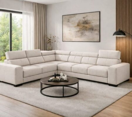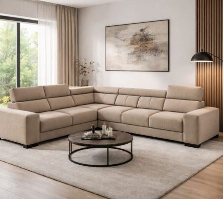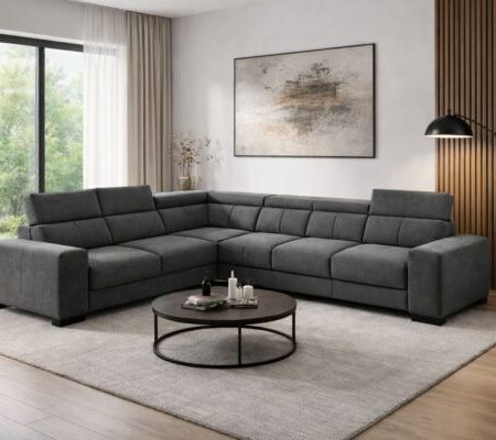 Elegantiška ir moderni modulinė kampinė sofa su puikiu dizaino ir komforto balansu. Erdvi konstrukcija ir reguliuojami galvos atlošai užtikrina maksimalų patogumą.